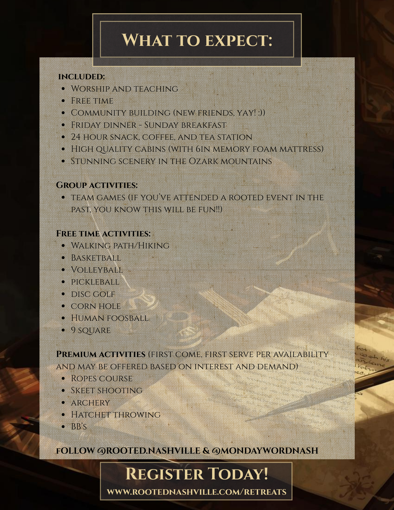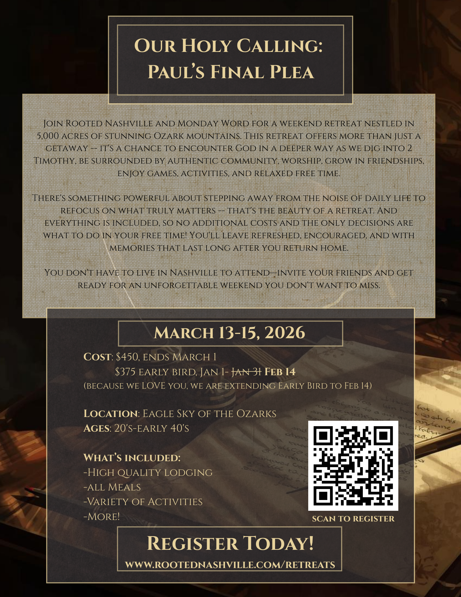 Join Rooted Nashville and Monday Word for a weekend retreat nestled in 5,000 acres of stunning Ozark mountains. This retreat offers more than just a getaway -- it's a chance to encounter God in a deeper way as we dig into 2 Timothy, be surrounded by authentic community, worship, grow in friendships, enjoy games, activities, and relaxed free time.